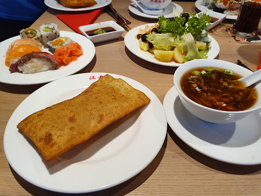 Read moreSehr stylisches Restaurant mit genügend gratis Parkplätzen. Sehr liebenswertes, bemühtes und aufmerksames Personal, das immer zur Stelle ist, wenn man was braucht. Der Service ist klasse. Klasse ist auch, dass das Personal einen darauf hinweist/fragt: ob man zur Vorspeise eine große Frühlingsrolle haben möchte oder Dim Sum oder ob man zum Nachtisch eine frisch zubereitete Nachspeise bestellen will, die zwar im Buffetpreis eingeschlossen sind, aber frisch serviert werden. Abzüge gibt es wegen der kleineren Auswahl, als wir es von St. Pölten gewohnt sind. Bei den Sushi Nigiri dürfte es ruhig mehr Fisch oder Auflage sein und etwas wenige Reis. Dafür gab es spannende Sushi-Variationen mit Rind, Pilzen, Tomago etc. Leider schmeckt die Soja-Soße hier auch nicht gut und ist sehr fischig und salzig. Beim Teppanyaki-Grill waren die Oktopusse und Muscheln sehr zäh und kaum zu kauen. Die Garnelen war teilweise auf den Punkt, teilweise leider etwas angebrannt. Also lieber die größeren Tiere nehmen. Es dürfte auch ruhig etwas mehr Soßen auf dem Teller sein, die leider wenig scharf und sehr mild gewürzt sind. Es gibt leider auch nur eine Sorte Udon-Nudeln, die aber sehr gut sind. Die Speisen vom Buffet, besonders die leckeren Suppen, sind...