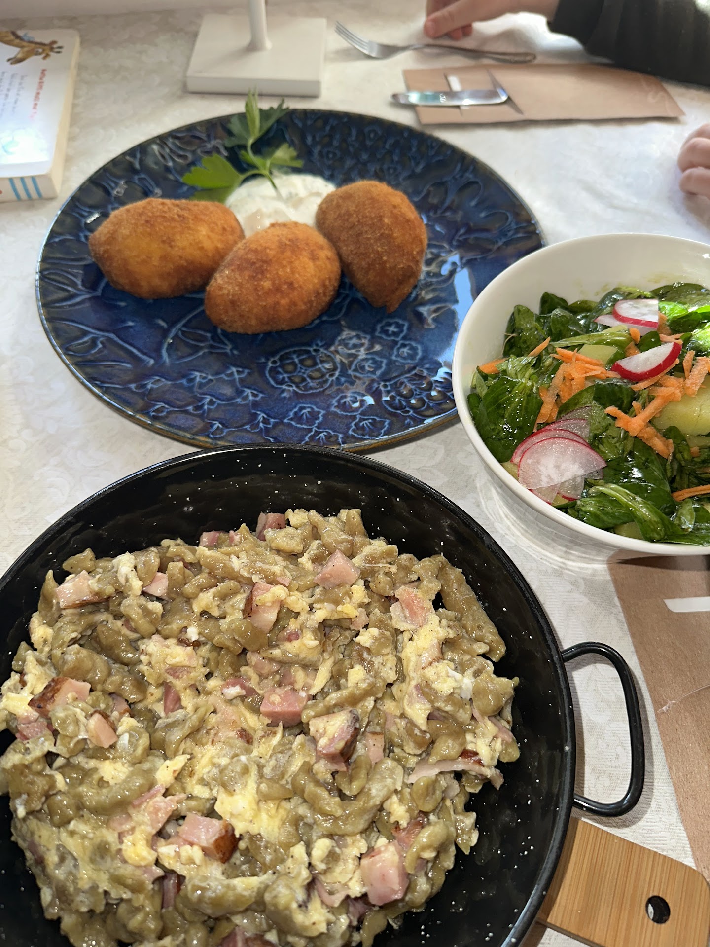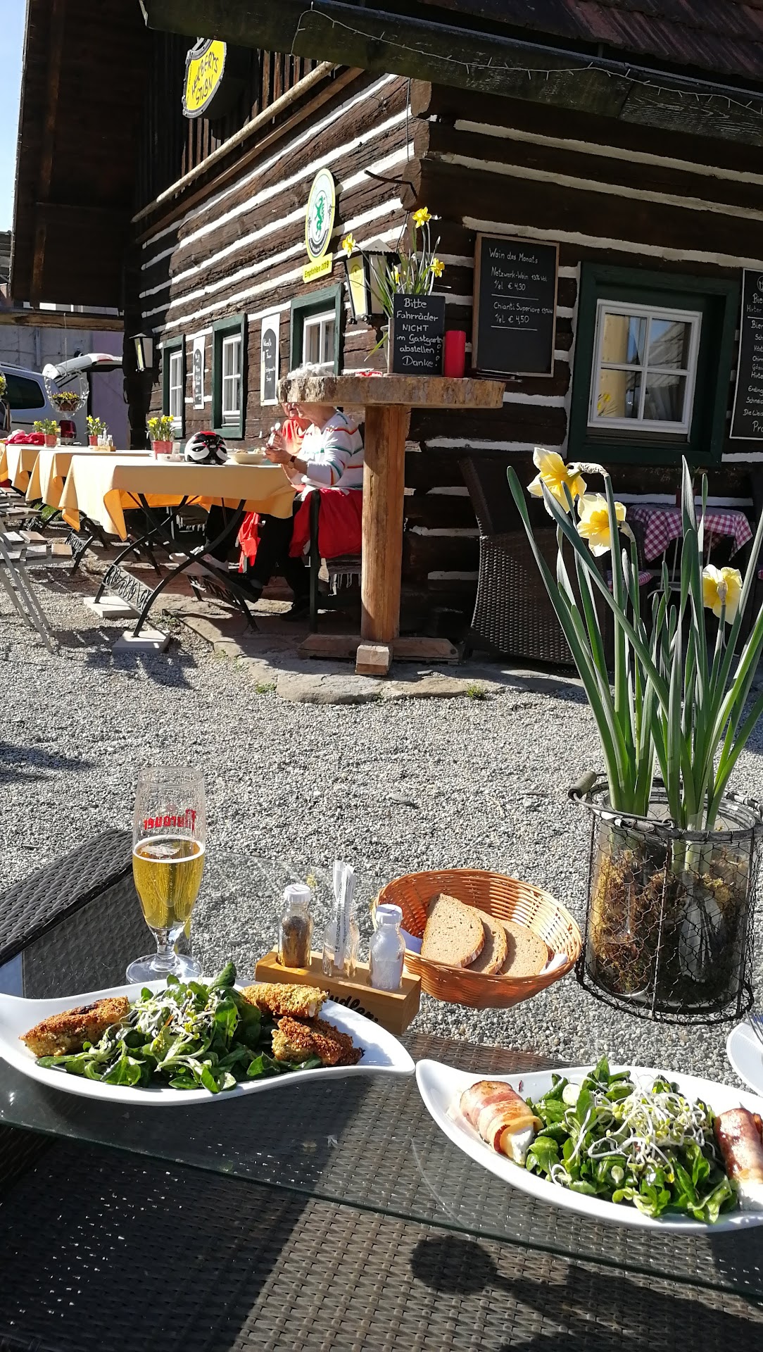 Unsere Wahl fiel auf das Erdäpfel-Cordon Bleu, Spätzle sowie einen kleinen Salat. Als die Portionen serviert wurden, dachte ich, ich sei im falschen Film – die Mengen entsprechen in anderen Gasthäusern den Kinderportionen! 😅 In der Küche mangelt es zudem komplett an Gewürzen. Weder die Spätzle, noch das Cordon Bleu oder der Salat waren auch nur ansatzweise geschmackvoll gewürzt. Nachwürzen war ebenfalls nicht möglich, da es es auf unserem „Abstellplatz“ keine Salz- oder Pfefferstreuer gab.
