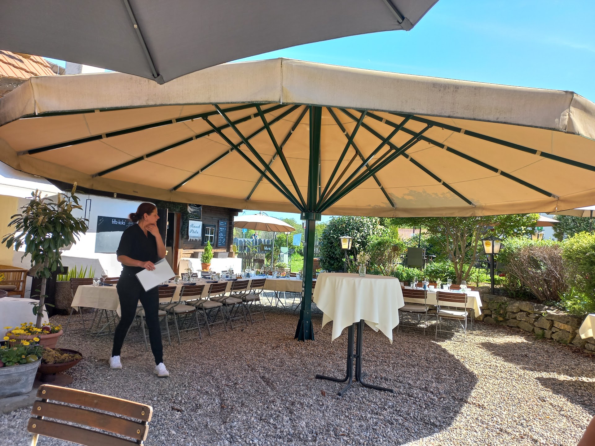 Ich war mit meinen zwei Kleinkindern am Sonntag kurz nach 11 Uhr mit dem Dorfwirt-Gutscheinheft dort. Wir bekamen einen Tisch in einem minimalen, verwinkelten Zubau, der wie das Abstelleck des Restaurants wirkte. Zu diesem Zeitpunkt war im eigentlichen Restaurant nur ein Tisch mit Stammgästen besetzt.