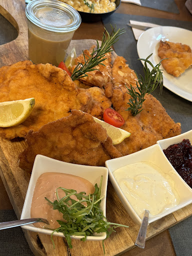 stopped at this restaurant for lunch and must say that it is place to definitely not miss! schnitzel is AMAZING!! 10/10 esp the combo plate! super crispy and well seasoned! salad with chicken breast was also 10/10, chicken breast was tender and crispy! these two are the must trys! mac and cheese was also good and cheesy! service is 10/10, super generous serving of sauces!! a super comfy and cozy place!❤️ good for big groups...