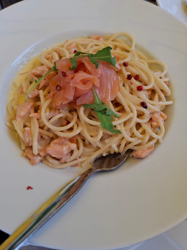 Despite the beautiful view and good atmosphere it's only a 2 star review for me. The service is not great but ok. The restaurant was busy and we had to look for the waiter to order. I ordered "Huhn natur auf buntem Blattsalat". When it arrived there was nothing colorful about my salad. It was literally white lettuce a view nuts and chicken. I do not understand how a very simple dish can look sooo unappealing. Especially during summertime when you can buy a million different lettuces and other salad ingredients anywhere. My mom ate the gnocchi dish, which was very heavy and smothered in sauce. We also checked the prices for their matcha latte and golden milk, they were off the roof 6 20euro to 7 50euro. Not sure why. Unfortunately a very mediocre experience for us. Very sad because the terrace and...