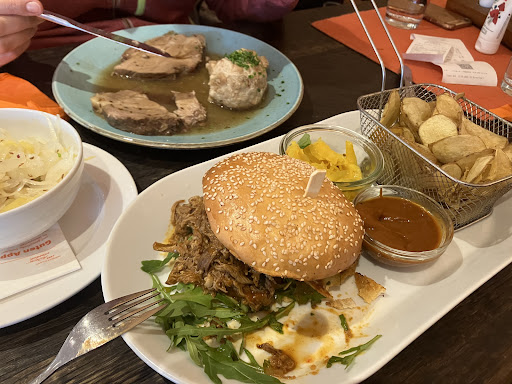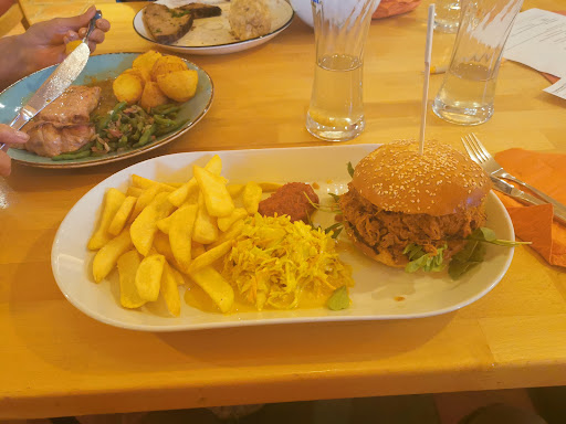 Dass man, wenn man über 1 Stunde geduldig auf sein Essen wartet, bemerkt, dass Gäste, die z.T um 30 Minuten später gekommen sind ihr Essen bereits bekommen haben, auf die Frage, ob die Bestellung vielleicht übersehen wurde, angeschnauzt wird, dass man dann 1 trockenen Schweinsbraten quasi ohne Saft serviert bekommt, 5 Minuten später ein Kotelett (das OK war) und nochmal 10 Minuten später einen lieb-und phabtasielos zubereiteten Burger mit kalten Pommes serviert bekommt, ist nicht verständlich und ebenso nicht annehmbar.