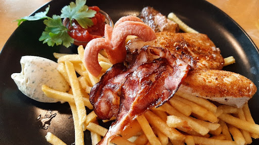 Ich bin durch die Bilder (hier) dort gelandet und muss sagen Bilder sind das eine, gut kochen das andere. Grillteller für über 17€ und dann minderwertiges Fleisch (das Rinderstück taugte als Suppenfleisch und schmeckte gammlig) mit blasgelben Billigpommes, jedenfalls nicht die auf den Bildern der anderen. Die Wurst schmeckte nach Chemie (Billigware). Zu allem roch die ganze Gaststätte auch nach Friteusenfett, sodass ich meine Kleidung danach erstmal auslüften musste. Die Dame war nett und versuchte mich durch ein neues Stück gebratenes Rindfleisch zufrieden zu stellen. Aber minderwertiges Fleisch bleibt nun mal minderwertig. Mein Tipp: kocht das, was ihr wirklich könnt und nehmt nicht solch billiges Zeug. Lieber ein gutes Stück...