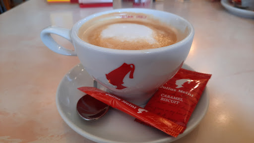 Wenn man nicht männlich und in Pension ist, fällt man in diesem Café auf. Die Bedienung ist flott und freundlich; der grüne Pass wird kontrolliert, allerdings nur oberflächlich (kein Runterscrollen, kein Ausweis). Die Speisekarte listet 4 Seiten Auswahl und 2 Seiten Allergene. Als Mehlspeise gab es lediglich Maronischnitte - die hat mich nicht vom Hocker gefegt, war aber frisch und ok. Für die Debreziner mit Senf und Kren brauchten wir 20 Minuten Geduld. Die Location mitten am Hauptplatz ist ein Plus, das Ambiente nicht unangenehm - man würde sich aber etwas mehr...