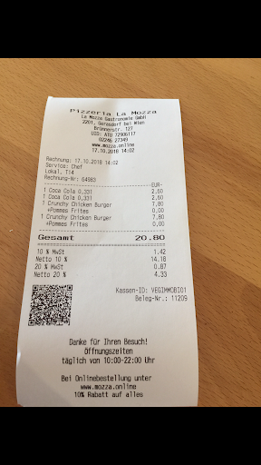 Read moreIch habe heute von la mozza bestellt, bis jetzt immer nur gutes gehört. Die Preise schienen mir sehr billig und freute mich sehr. Ich habe einen Kebab und einen Burger bestellt dauert was 15 min zu machen? Ich wohne 10 km entfernt also sollte eine Lieferzeit von 30 + das machen von 15 Minuten ja ok sein oder? Ja kein Problem aber es dauerte über zwei Stunden. Nach einer Stunde riefen sie mich an und sagten der Fahrer fährt gleich los. Nach 40 Minuten ruft ich an. Er sagte er fährt gleich los. Erst nach 20 Minuten kam er an. Ist ok da sie uns 2l Cola geschenkt haben aber.. Zwei Stunden für einen kebab und einen burger ist...