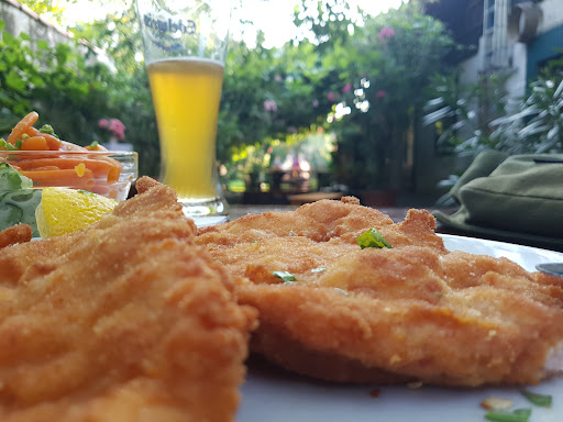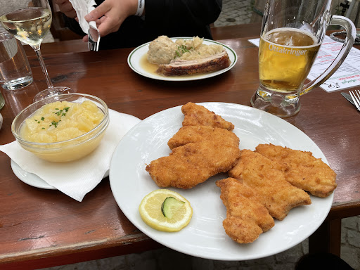 Letzten Sonntag in Gumpoldskirchen unterwegs, und wir hatten lange überlegt, wo wir essen sollten. Da entschieden wir uns für diesen Ort - Der Garten sah von außen sehr einladend aus. Und tatsächlich, die Atmosphäre war gemütlich und einladend – genau das, was man sich bei einem Heurigen erwartet. Der schwarze Frenchie hat die Atmosphäre noch einmal auf ein höheres Niveau gebracht. Die Speisekarte bietet typische österreichische Gerichte, darunter gulaschartige Speisen und klassische Schnitzel. Es gibt auch kleinere Gerichte zum Stärken und eine gute Auswahl an Nachspeisen. Getränkeauswahl ist ebenfalls gut. Die Essensauswahl ist zwar nicht riesig, aber sehr gut gewählt. Da braucht man nicht mehr - Besser weniger, aber besser, als viel, aber schlecht Wein hatten wir nicht gekostet, lediglich ein einfaches Cola und zwei Traubensäfte (ohne Wasser - man wird aber gefragt, ob man welches haben möchte). Entschieden haben wir uns für zwei Schnitzel, darunter ein Surschnitzel, das hervorragend zubereitet war – saftig mit einer guten Panade. Besonders gut haben mir auch die zwei Cordon Bleus gefallen, auch wenn ich sie nicht selbst bestellt hatte. Außen knusprig und innen zart mit schmelzendem Käse. Dazu wurden Pommes bestellt, und man wurde gefragt, ob man Ketchup, Mayo oder beides dazu möchte. Die Pommes waren knusprig und gut zubereitet, dem Preis sehr gerecht. Auch wurden zwei Gurken- und zwei Krautsalate bestellt. Gurkensalat: Die Gurken schön dünn geschnitten. Das Dressing war leicht, nicht zu fettig, und gut abgeschmeckt. Hat super zum Essen gepasst und war echt erfrischend. Auch der Krautsalat war richtig gut; knackig, nicht zu hart, und angenehm gewürzt. Hat frisch geschmeckt und war eine tolle Beilage. Die Portionen von der Größe her standardmäßig bis groß, auf jeden Fall wird man satt. Das Preis-Leistungs-Verhältnis ist generell sehr überzeugend. Das Personal war sehr nett und aufmerksam, das möchte ich wirklich STARK betonen! Die Kellnerin, die unsere Bestellung angenommen hat, war war sehr höflich und freundlich. Das Essen war schnell da, und beim Kommunizieren war das Personal wirklich sehr angenehm und freundlich. Kann man definitiv nur loben. Wenn wir wieder in Gumpoldskirchen sein sollten, wissen wir, wo wir...