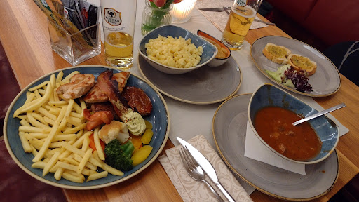 We had the mixed grill (fries were frozen, I believe, which is a pity and I'm not sure whether the meat was actually grilled, certainly not over an open flame), the goulash starter dish, the homemade garlic bread which was only 4 slices with a small salad, and the spätzl with gravy, which was amazing.