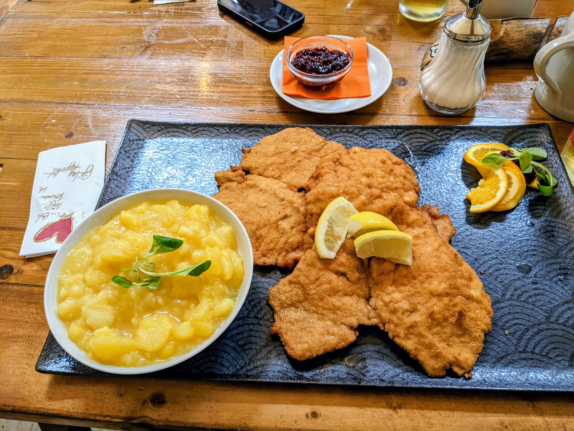 Great value-for-money Schnitzel (and other items) for the whole family. The pork Schnitzel viennese style were done very well - thin, beautiful colour, good crust, not overly greasy. The meat could maybe have been seasoned a bit more before putting it into flour/egg/breadcrumbs but it was good and this is easy to fix with some pepper/salt on the table. Ketchup appeared to be free, Preiselbeeren (lingonberry) was extra (a bit more than 2€ surcharge for a small bowl).