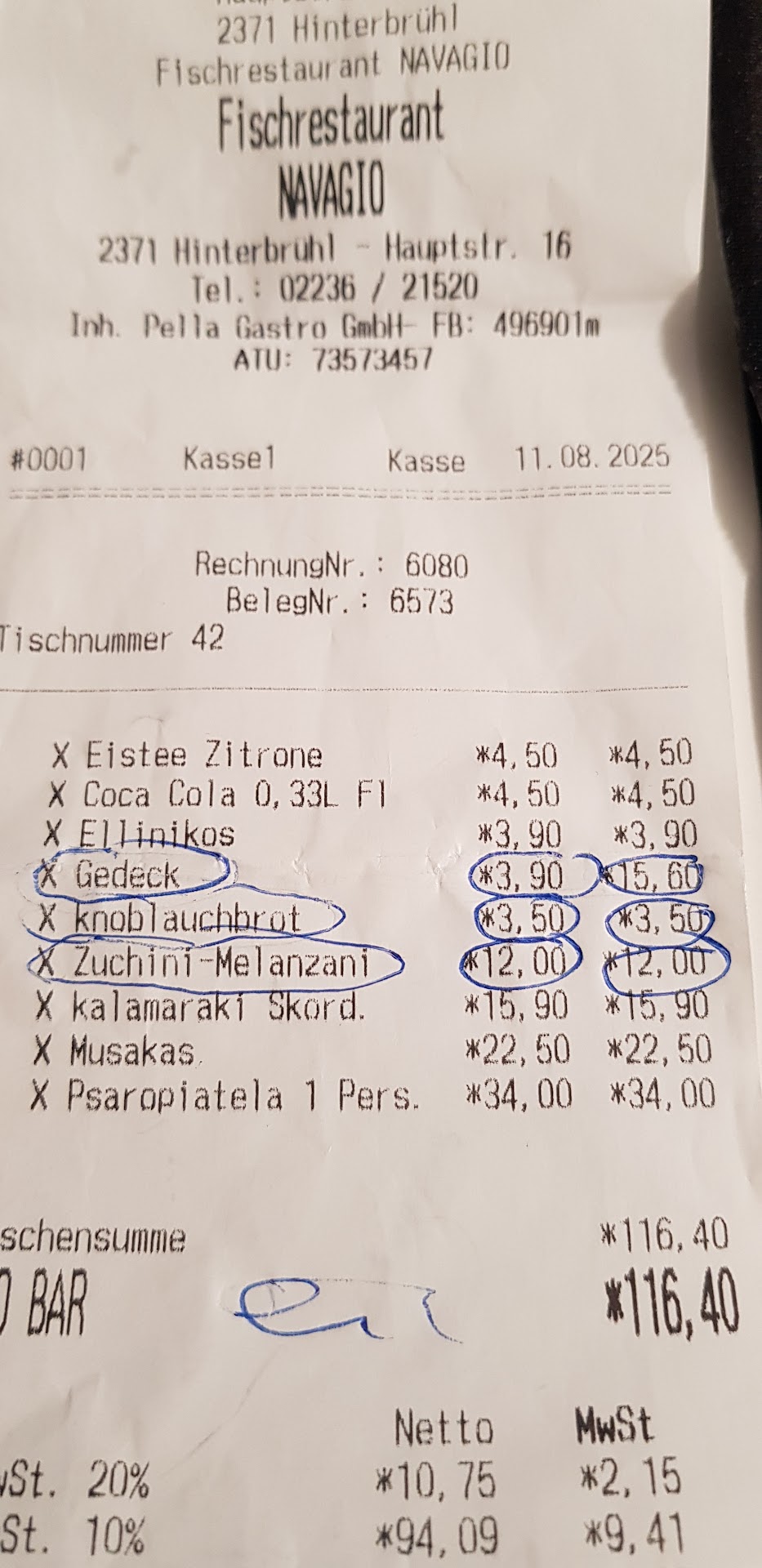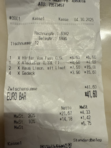 Zusätzlich wurde uns ein Gedeck verrechnet, das wir nicht ausdrücklich bestellt hatten – mit 3,90 Euro pro Person, also insgesamt 15,60 Euro. Zumindest eine kurze Information vorab oder beim Servieren wäre hier angebracht gewesen. Ob das alles Absicht war oder ein Versehen – man sollte die Rechnung vor dem Bezahlen in jedem Fall...