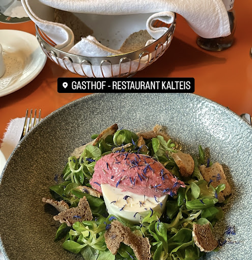 Read moreTelefonische Reservierung hat sehr gut geklappt. Tisch für zwei war sehr schön vorbereitet. Die Chefin selbst,äußerst freundlich und bemüht,im Service tätig,ein Sonnenschein zusätzlich zum sonnigen Tag.Die Bestellung,viel Knoblauchbutter zum Fisch wurde berücksichtigt und stilgerecht in flüssiger Form und in schönem Porzellan zum Tisch gebracht. Der Küchenchef und Hausherr zugleich servierte das Essen, gekonnt und mit einer äußerst positiven Ausstrahlung. Die Empfehlung für das Dessert,für meine Partnerin gab es frische Erdbeeren mit selbst gemachten Zitronenbaiser und Buttermilchwaffel und für mich eine Hausgemachte Malakofftorte, hielt was sich der Gaumen erhoffte, eine Geschmacksfreude! Zwischendurch ein freundliches informatives Gespräch noch mit der Chefin lockerte unseren Aufenthalt noch auf. Die frische Forelle mit knuspriger Haut und der knoblauchgespickte Wildschweinschopf haben unseren Appetit nach der Radtour nicht nur gestillt sondern große Zufriedenheitsmomente entstehen lassen. Ich war (leider) erst das erste Mal beim Kalteis, Fortsetzung folgt jedoch sicher. Übernachtungsmöglichkeit gibt es auch. Machen Sie nicht den gleichen Fehler wie ich und warten Sie nicht soo lange auf ein sehr sehr gutes Essen in sehr angenehmer Atmosphäre beim...