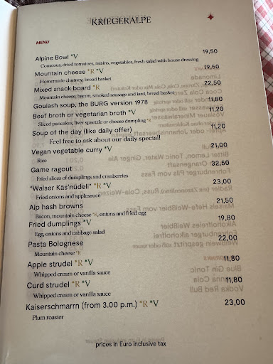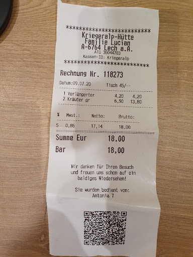 Abzocke !!! Wir (mein Mann und ich) sind nach einer lĂ€ngeren Wanderung hier eingekehrt. Die Preise auf der Karte sind schon "stattlich" - das ist aber unternehmerische Freiheit und man kann ja auch wieder gehen... Haben wir nicht gemacht und zwei Almdudler, einen CafĂ© (VerlĂ€ngerter) und ein StĂŒck Kuchen bestellt. Entgegen der Angabe auf der GetrĂ€nkekarte (Almdudler 0,25 l) brachte die Bedienung dann allerdings zwei offene 0,5 l GlĂ€ser mit einer KrĂ€uterlimonade, welche mit Almdudler nicht viel zu tun hatte... An der Stelle hĂ€tten wir schon nachfragen mĂŒssen - haben wir leider versĂ€umt. Wir hatten Durst und wollten (zu diesem Zeitpunkt) keinen Streit. Der Kuchen wurde leider ganz vergessen und nach 15 Minuten verlangten wir die Rechnung. Diese war natĂŒrlich mit Kuchen - wurde aber schnell korrigiert. Jetzt fragte mein Mann doch noch einmal nach, wieso wir ein GetrĂ€nk serviert bekamen, welches nicht einmal auf der Karte zu finden ist. O-Ton der Bedienung: "Das wollen unsere GĂ€ste hier so - wenn man die GröĂe von der Karte möchte, mĂŒsse man das sagen..." Plötzlich mischte sich eine Dame vom Nachbartisch ein - sie hatte das gleiche Problem wie wir.... Also offensichtlich kein Zufall, sondern eine gezielte Masche. Wir haben die Rechnung bezahlt (siehe Foto) - ich kann allerdings vor der Kriegeralpe aufgrund des unseriösen GeschĂ€ftsgebahrens und der völlig ĂŒberhöhten Preise...