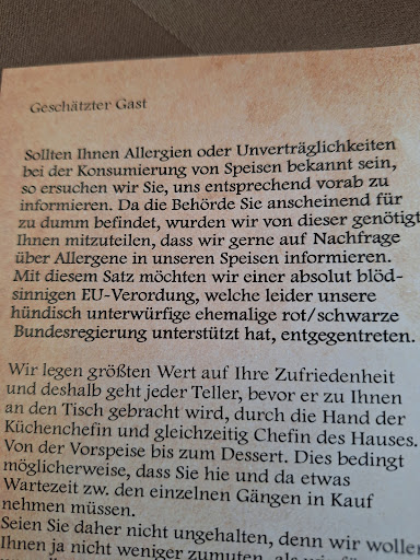 Read moreEssen und Service ausgezeichnet, allerdings sollte sich ein Gastronom politische Kommentare auf der Speisekarte sparen - er verliert damit 50 Prozent der...