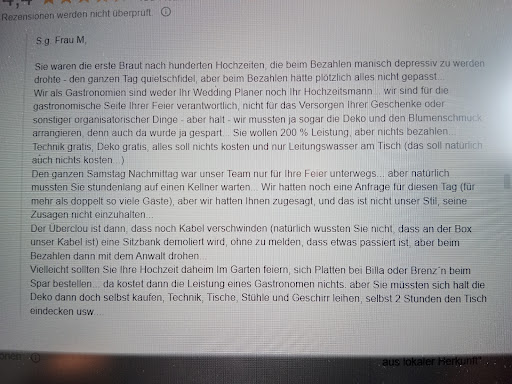 Aber ja, Sie haben Recht. Lieber organisieren wir beim nächsten Fest alles selber mit Brezen, Brötchen, als knappe 1.600€ (28 Personen) für so eine enttäuschende Feier und anschließenden...