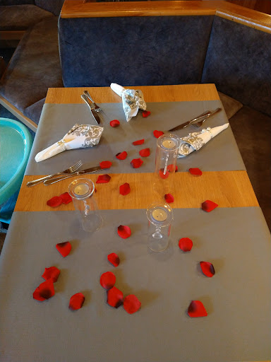 Kurze Zeit später kam ein anderer Mitarbeiter und sagte: "sie feiern doch ihren Hochzeitstag. Wir haben innen einen Tisch für Sie dekoriert." Wir waren sehr gerührt von der Geste und wechselten an den Tisch, auf dem Rosenblätter und Kerzen verteilt waren. Sogar ein Kinderstuhl stand schon bereit.