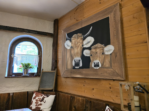 Read moreWir hatten an einem verregneten Sommertag einen Ausflug ins Kleinwalsertal gemacht und sind dort am Ende in Baad im "Kuhstall" gelandet. Ein öffentlicher, kostenpflichtiger Parkplatz (parkster-App) ist direkt nebenan. Das Lokal ist innen sehr schön eingerichtet und der Name passt. Die Mitnahme unseres Hundes war kein Problem und er wurde mit Wasser versorgt. Die Bedienung war supernett und wir haben uns sehr wohl gefühlt. Meine gehbehinderte Mutter kam ohne Probleme in das Lokal und auch die WC sind ebenerdig erreichbar und sehr sauber. Wir hatten uns für den Kaiserschmarrn aus Dinkelmehl entschieden, wofür man etwas Zeit mitbringen sollte, da er ganz frisch zubereitet wird. Aber wir waren ja im Urlaub und hatten genügend Zeit zum Verweilen mitgebracht. Die Portion war üppig und sehr lecker. Der anschließende Kaffee wurde mit hausgemachten Kuh-Plätzchen serviert. Sehr goldig :-) Wir werden beim nächsten Mal auf jeden Fall wieder...