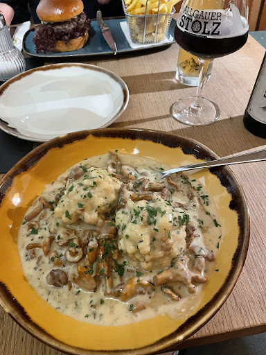 Zum Essen haben wir zweimal das Knödel-Trio bestellt. Einmal mit gebratenen Pfifferlingen extra. Die verschiedenen Knödel waren sehr lecker und saftig. Die Portion war reichlich bemessen und Preis-/Leistungsmäßig völlig angemessen. Die extra Pfifferlinge waren frisch und auf den Punkt gebraten. Der extra kleine Beilagensalat war ebenfalls sehr frisch mit einem leckeren Dressing.