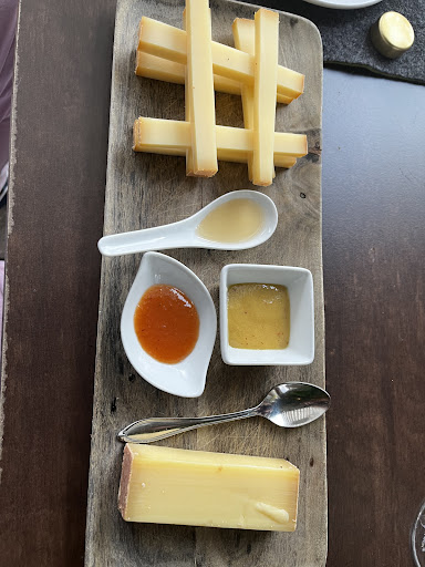 Zum Dessert: Wunderbarer lokaler Bergkäse für mich und für meine Frau "Creme Brulee´ aus gestockter Buttermilch mit süß/saurem Fichtengelee überkrustet – eingelegte Früchte – Quittencreme – Eis von der Walser Hagebutte.