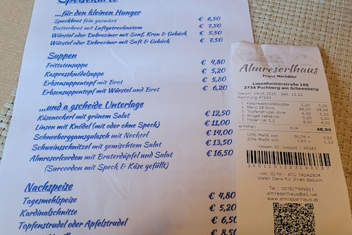 Read moreDas Almreserlhaus in Losenheim auf 1.222 m Höhe bietet eine beeindruckende Aussicht bis zum Neusiedlersee. Die Sonnenterrasse lädt zum Verweilen ein, während die Zimmer mit Panoramablick überzeugen. Die Küche wird von Gästen als hervorragend beschrieben, insbesondere das Speckbrot und der Schweinsbraten. Der freundliche Service und die schnelle Bedienung tragen zum positiven Gesamteindruck bei. Die Hütte ist sowohl im Sommer als auch im Winter geöffnet und bietet Übernachtungsmöglichkeiten in Bettenlagern und einem Zweibettzimmer. Gruppen können nach Voranmeldung untergebracht werden. Bitte beachten Sie, dass eine direkte Zufahrt mit dem Auto nicht möglich ist; der Aufstieg erfolgt zu Fuß oder mit der Sesselbahn. Montagabend und Dienstag...