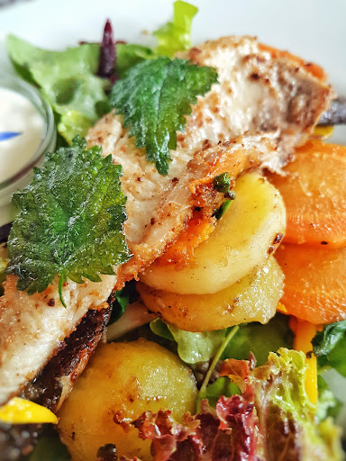 Amazing view from the terrace, seasonal & regional dishes - top organic quality. Even me, as a vegan found myself something to eat. I went for the marinaded vegetables, the home-made bread and couscous-patties with a great potato-salad and green-salad.