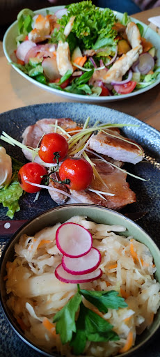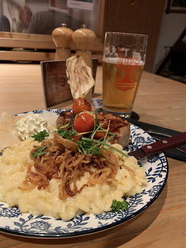 My partner and I arrived just a bit late and they were closing, I asked if they could do something for take away and they gave us many options. We really appreciated the fact that even though they were closed still they made the effort to serve us some amazing food! And we deeply thank you for that. The food was so delicious! We ordered Rindergulasch and Salat mit Hähnchenstreifen. The meet of the goulash was tender and tasty. The chicken of the salad was cooked perfectly full of flavour. The size was quite big for the 2 of us and the quality is amazing. My partner and I have been travelling along the north west of Austria and this is one of the coolest places we have been so far. It feels so cosy! We definitely recommen this place and the area because the...