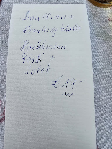 Read moreRespekt: Hier steht die Chefin seit dem Jahr 1968 in der Küche und bedient auch selbst. Super Hausmannskost. Liebevoll gekocht und serviert. Guten draht zu einer lokalen Metzgerei. Daher auch in einem offenbar vegetarische Gericht wie Polenta ein bisschen Speck drin oder in der Spätzlesuppe ein bisschen Bratwurstfüllung in den Spätzle. Schmeckt halt gut. Wir waren gleich 2 mal hier. Einmal das Menü (s. Bild), alles sehr lecker zum unschlagbaren Preis. Und dann auch Schnitzel, Bauernschnitzel und Röstigerichte gegessen. Auch super lecker. Sehr attraktive Preise. Das Ambiente ist einfach, sauber und herzlich. Kein Schicki-Micki... da geht man besser woanders hin. Ach ja: wir hatten nix zu Mittag und waren um 17 Uhr dort essen - kein Problem - durchgehend...