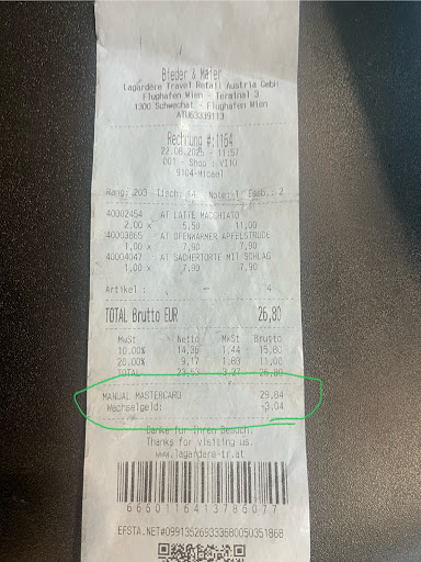 When I carefully checked the receipt afterwards, I saw that 29.84 euros had been charged to the credit card, and 3.04 euros was written as “change” .