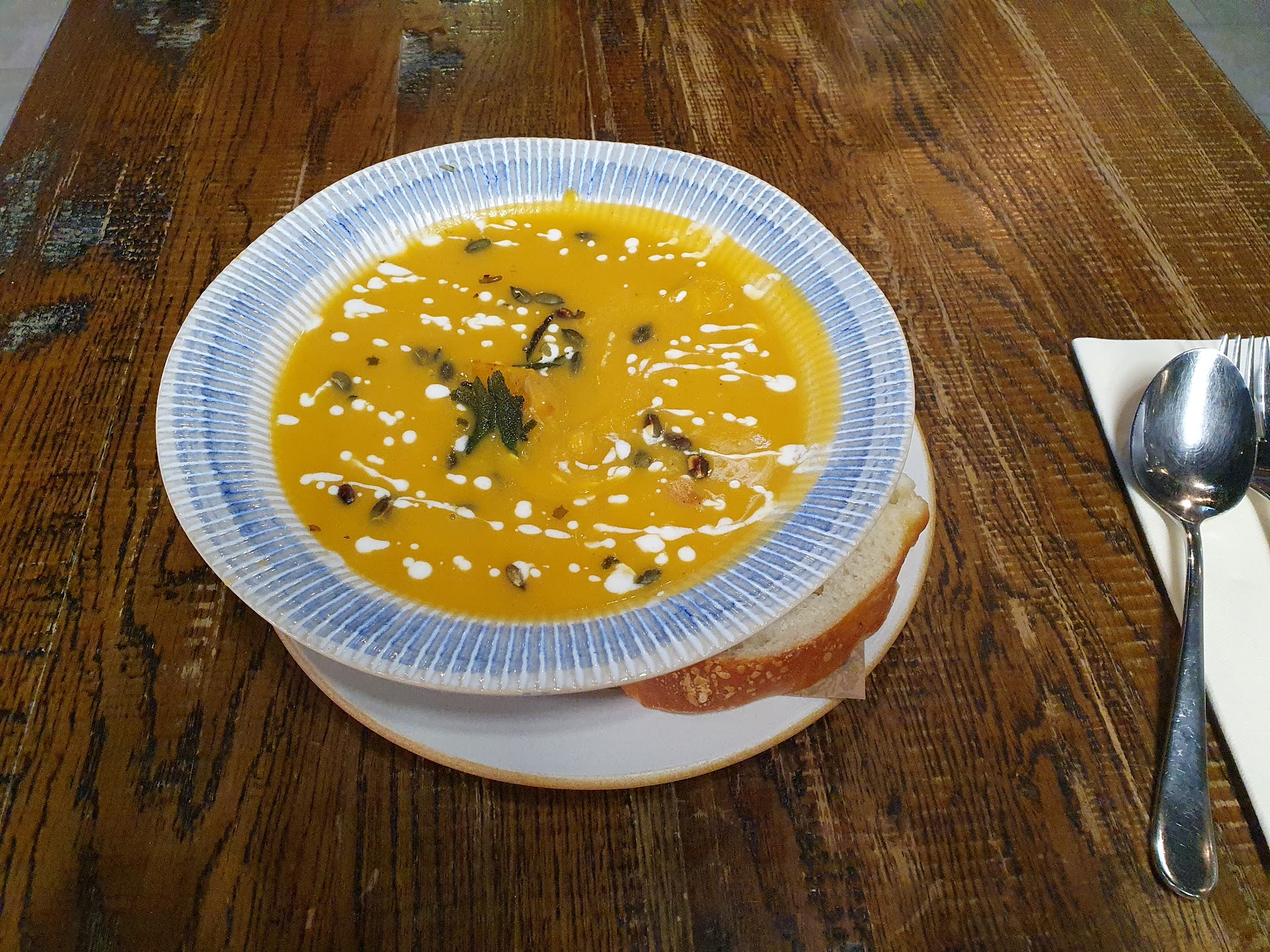 The reason I kept the soup for last is that I initially didnt want to include it - it seems to be seasonal, in my case being October, it was pumpkin soup - I'm normally not really fond of pumpkin, and I had forgotten to ask about the type of soup before ordering, which is completely on me - so it was a surprise that I thought it was quite decent (and also pretty). They also give you a small slice of freshly baked bread, which was sadly a bit small, as I really enjoyed the smell and taste of it together with the soup.