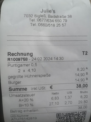 Read moreZufällig hier gelandet, wollten ein neues Lokal versuchen. Von außen unscheinbar, innen im hinteren Zimmer neue Ausstattung, Tische nett dekoriert, grüne Stühle, passend zum anklopfenden Frühling. Wir hatten 2 große Puntigamer Bier (4,10), 1 Hühnerspieß(2 Stück mit Zucchini, Paprika und Zwiebeln) mit Pommes, Cheeseburger(Dicker, grober, gut gewürztes Fleischlaibchen, knackiger Eisbergsalat, Zwiebeln, Käse oban und unten, Cocktailsauce) mit Pommes(je 14,90, große Portionen, die wir aber auch erwarten und essen können) Alles sehr frisch und lecker. Fotos von den Speisen nächstes Mal, wir waren sehr hungrig. Wartezeit(weil hier einige deswegen geschrieben haben) auf die Speisen ca 20 Minuten, empfinde ich nicht als lange, war früher überall normal, als noch alles frisch gemacht und gekocht wurde, was bei Julie's definitiv wurde. Wir kommen sicher wieder, danke für Ihre Gastfreundschaft und...