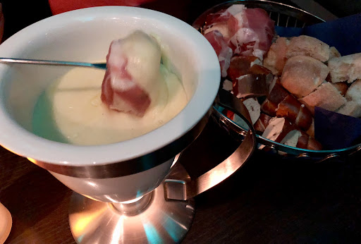 Die neue Karte weckte vor einigen Wochen unser Interesse. Zwar wurden wir vom montäglichen Fondue-Abend enttäuscht, weil das Käse-Fondue mit Brotkorb für zwei schmackhaft aber mengenmäßig doch recht überschaubar war, wagten es aber nach einiger Zeit noch einmal. Diesmal wählten wir von der Karte, wobei es auf Nachfrage kein Problem war, einen vegetarischen Burger zu bekommen.