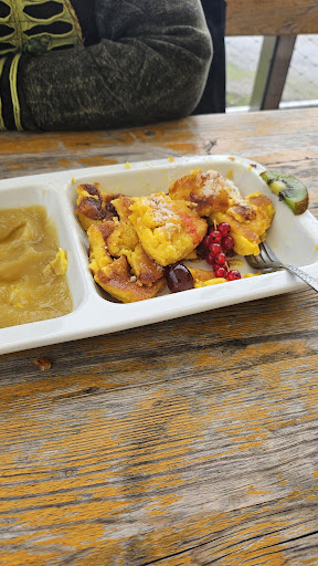 Read moreFür uns war das einzig Positive der Ausblick. Die Kellner*in machten einen latent genervten Eindruck. Als wir (2 Erw., 2 Ki.) bestellen wollten, gab es schon die erste Überraschung: die Orangenlimo, sei keine Limo, sondern purer Saft. Ja gut, aber dann schreibt man es nicht bei der Limo hin. (Edit: soviel zum genauen Lesen der Speisekarte 😉) Als wir mit unserer Bestellung fertig waren, kam die Frage, ob das alles sei, die eher wie eine Androhung klang, bloß nicht mehr zu bestellen. Wir hatten letztendlich ein alkoholfreies Bier, ein Schiwasser, einen Almdudler, zwei Kindergerichte und den Kaiserschmarrn. Dafür haben wir dann geschmeidige 58,30 € bezahlt. Die Gerichte waren furchtbar schlecht. Die Pommes beim Kinderessen komplett versalzen (Edit: stand so auch nicht in der Karte), das Schnitzel so groß wie ein Bierdeckel (dafür dann 14,- €), die Grillwurst war frittiert und der komplett neutral schmeckende Kaiserschmarrn war wie süßes Rührei mit Tetrapakapfelmus für elegante 17,50 €. Keine Rosinen, keine Preiselbeeren. (Edit: Hätte ich mich jetzt beschwert, dass kein Zwetschgenröster dabei war, könnte man durchaus über mein Leseverständnis diskutieren. Aber stimmt. Apfelmus ist schon sehr aufwendig...)