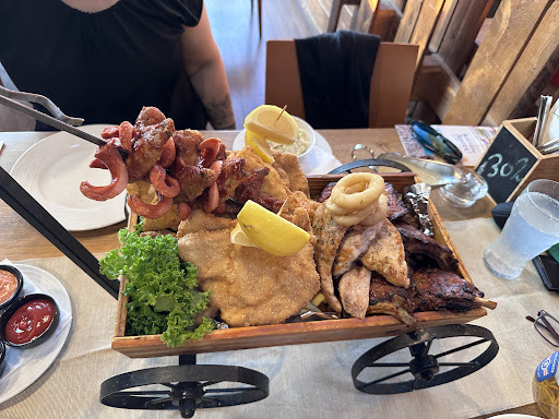 Read moreRead moreXXL-Restaurant im "Novo Park" im IZ NÖ Süd in Wiener Neudorf. Das Ambiente ist gemütlich, es ist ausreichend Platz für die einzelnen Tische - und erinnert an andere amerikanische Restaurants im Süden Wiens im Industrial Style, ein gut funktionierendes Konzept. BIER: Das Bier vom Fass ist gepflegt, es gibt von der Brau Union: Puntigamer (das meistverkaufte Bier Österreichs, kann also nicht falsch sein) und Gösser - und das auch im Pitscher oder vom Tender am Tisch. Auch der weiße Spritzer wurde sehr gepflegt und gut gekühlt in einem schönen Glas serviert. SUPPE: Wir hatten "Rindssuppe mit hausgemachten Fritatten" - die Fritatten waren reichlich und tatsächlich hausgemacht. Die Rindssuppe selbst war leider geschmacklos und ohne Fettaugen - nicht gut, haben wir auch vor Ort kritisiert. Als HIGHLIGHT hatten wir das Fuhrwerk (für 4 Personen um 89,- EUR): gegrillte und panierte Putenschnitzel, Wiener Schnitzel, Spareribs, Chicken Wings und Frankfurter mit Pommes, Wedges, Onion Rings, American, Knoblauch Dip, Kräuterbutter serviert in einem rieseigen Fuhrwerk mit Schwert. Wirklich ein Highlight. Die Fleischqualität war sehr gut - das ist heutzutage schon selten!! Die frisch (Top!!) gemachten XL-Schnitzel waren wohl aus dem Kombidämpfer, ok - war eh innen saftig und knusprig, aber klassisch tadellos herausgebacken ist es mir persönlich dann halt doch lieber. Die Spareribs waren superzart und weich - mir fast schon eine Spur zu zart. Nachher waren wir wirklich mehr wie satt! COCKTAILS: ...gibt es leider keine, enttäuschend - obwohl auf der coolen Tafel an der Wand angeschrieben (und auch auf ggogle findet man "für gute Cocktails bekannt" - Verbesserungsbedarf. EIS: Wir hatten dieses Trüffelding, war gut - hatten wir uns aber lt. Karte (mit Trüffelsauce) etwas anders vorgestellt. Alles in allem gute handwerkliche Arbeit mit Optimierungspotential. Gut betreut wurden wir. Wohlgefühlt haben...