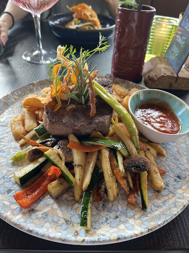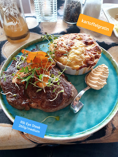 Als Vorspeise hatten wir eine Rindsuppe mit Frittaten sowie panierten Parasol. Beides war mit Liebe angerichtet und ein Gedicht. Zur Hauptspeise wählten wir ein Filetsteak mit Gemüse und Pommes sowie Kürbis-Karotten-Tortelli mit Mangold und Nüssen. Sowohl das Steak als auch die Nudel waren sehr schön angerichtet und schmeckten vorzüglich. Die Fleischqualität als auch die Garstufe passten perfekt. Es werden sehr viele regionale Produkte verwendet.