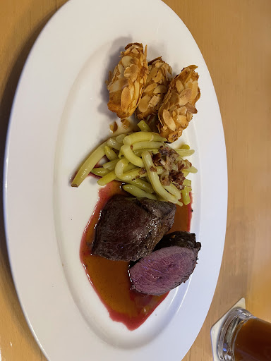 Hauptgang 8,5/10, ein tolles Schnitzel, Petersilienkartoffeln geschmackvoll, Schnitzel schön souvliert. Luft nach oben gäbe es noch, wenn es in Butterschmalz gebacken und mit etwas mehr Liebe angerichtet...