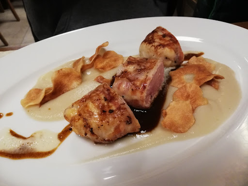 Vorspeise 07/10, Gesamtkomposition harmonierte einfach nicht, am besten war die Knoblauchreduktion. Das Kürbisparfait wurde vom Steinpilz geschmacklich gekillt.
