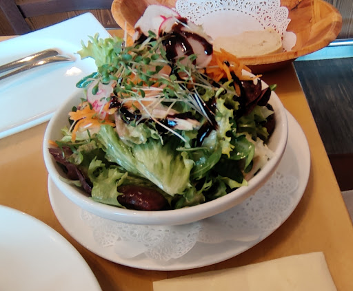 Salat 6,5/10, gut, frisch, hat etwas geknirscht beim kauen, Dressing okay, nicht mehr, nicht weniger. Oben drauf leider dieses Balsamico Glaze Zeug...