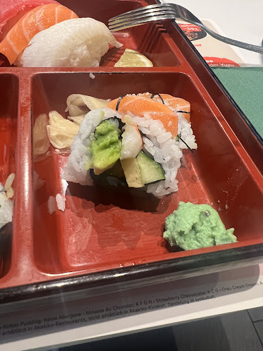 We had sushi and salmon and shrimp bowl. First off, the sushi was cut very chunky and put together very amateurish. The taste was rather stale, which i have told the lady serving. She then asked me to go to the kitchen to speak to the chef, who showed me that they are always cutting fresh fish. What they said i understood very little of, because their English was not that good, and my German is even worse, so we did little by way of communicating with one another. I ended up apologising, not wanting to offend him. The lady serving us gave us another pack of sushi to go, which i was unclear that she was going to do, surely to not end on a low note. Secondly, the images may give off the wrong impression: the salmon and shrimp looked plentiful in the picture, what we received were two small bits of salmon and some shrimp, all drowned in a tomato sauce.