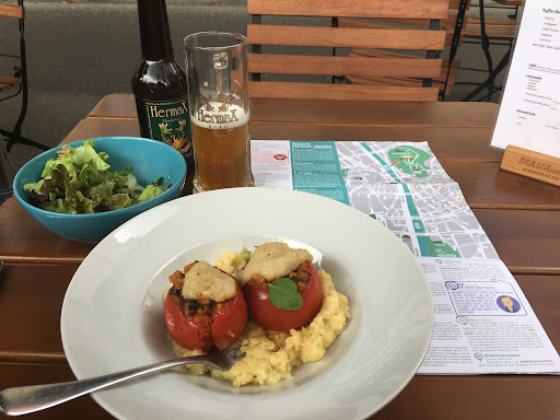 The vegan Café Erde is a healthy/organic place, named after 'Erde', the German term for 'earth', located right at Andreas-Hofer-Platz in the Center of Old Town of Graz. Its staff is friendly and willing to help and the atmosphere is relaxed, an ideal spot to chill out amongst the alternative scene. The Café Erde even features a big and sunny Gastgarten (patio), what is quite an exception for a location in the center. The food is great: We had a Caffé Latte and an Apfelschnitte (Apple Pie), as well as a Cappuccino, a peach juice and a peanut tart on a another day. All is organic here and tastes healthy and the coffe is Fair Trade. This place is small but very cosy in a sense that they know how to make the most of the architecture and have a nice interior as well as this community feel. And the opening hours are great as well here (open till 10 pm). And for all the vegans out there, it's all vegan here!