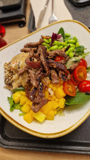 Gestern gaben wir der Filiale nochmal eine Chance. Ich bestellte die Crunchy Chicken Bowl â allerdings mit Rind statt Huhn â und meine Kollegin den Melon Summer Salad. Schon beim ersten Blick fiel uns auf, dass der Salat verwelkt war und wir viele Teile aussortieren mussten. Dazu fehlte der im Produkt beschriebene SchafskĂ€se komplett, einige MelonenstĂŒcke waren bereits schlecht und das HĂŒhnerfleisch teilweise wieder nicht durch. Nach unserer Beschwerde wurde uns zwar ein 5-Euro-Gutschein von der Filialleitung angeboten, was wir als sehr kulant empfanden â dennoch tröstet das leider nicht ĂŒber die wiederholten MĂ€ngel hinweg.
