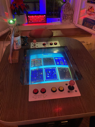 Umgebend von Videokassetten, Spielekonsolen, Büchern und Getränkeuntersetzern in Form eines Pac Man Geistes und vielen mehr. Fühlt man sich sofort zurück in die Vergangenheit versetzt.