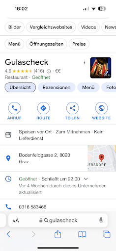 Read moreDas Gulascheck in Eggenberg bietet mit Abstand das „Beste Gulasch“ in Graz, auch die restlichen Speisen schmecken so wie ich es mir vorstelle! Das Knoblauch Schnitzel schmeckt wie damals bei meiner Oma, ein Traum, Gordon bleu, Schnitzel, Suppe, egal, hier ist alles gut! Die Chefin und der Chef sind ein Original, lustig und engagiert, nix für politisch korrekte Schnösel! Dem Bier wird beim einschenken die nötige Zeit geschenkt und das schmeckt man auch! Preise und Portionen sind genau richtig! Einrichtung ist urig und trotzdem modern, komisch ist aber so! :-) Es gibt nur ein einziges Manko, wenn ich hier zu oft esse, habe ich bald keinen Platz mehr zwischen Tisch und Bank. 😊 Ich werde dann wohl an der Theke mein Gulasch und Bier genießen müssen! Bitte...