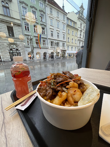 The taste is exceptional. It is not too salty, nor oily and it has 3 or 4 sauces if you like. For 9.90 Euros, you can have fried shrimp, pan fried shrimp , stuff crab leg claw. One can essentially fill the whole bowl with shrimps for the same price but please don’t that because the owners need to make a profit too. A McDonald meal will cost that much money. I had a croissant and a coffee and it was 8 Euros. A burger costed me 9.10 Euros (granted, I was in Hallstatt, a super touristy place with astronomical prices . Even the use of toilet there costs 1 Euro ). This price is so low that I felt bad for getting so much that I had left over for another meal. On top of that, sweet and sour soup is included. You can get a to go bag , chop sticks , forks , spoon and napkins. Inside the restaurant , they have a stack of napkins in case you needed more. The restaurant sells a variety of drinks and package noodles and snacks. The shelves are brightly lit and very conducive to buying. I just admired the variety the products there. The bathroom is clean and the paper towels for drying didn’t run out. I ate there twice in 2 days. If I stay longer, I would go there every day. I love their ducks, broccoli, dumplings, beef, …everything. The name of the restaurant in Chinese is 美食 meaning delicious food and it definitely lives up...