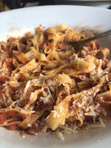 Ich entscheide mich auf jeden Fall für die Tagliatelle all‘arrabiata. Normalerweise kann man da nichts falsch machen, so war mein Grundgedanke. Ehrlich gesagt, hatte ich mir nicht so viel von dem Essen erwartet. Ich hoffte auf etwas, was einigermaßen gut ist, appetitlich aussieht und schmeckt. Was mir dann aber vorgesetzt wurde, nein serviert wurde, dass war dann aber erstklassig! Eine gut dosierte Soße, nicht zu viel und auch nicht zu wenig umschmeichelten die Tagliatelle. Die Pastasoße hatte nicht nur die richtige Konsistenz, sie hat auch genau richtig Dosis Schärfe. Die Schärfe stammt von den roten Peperoni-Stücken und nicht von irgendeinem Fertigpulver. Kleine Tomatenstücke und Kräuter waren zu erkennen und gekrönt von Parmesanabrieb, der nicht zu Tode gerieben wurde. Offensichtlich steht in diesem Lokal, jemand am Herd, der oder die eine gute Pastasoße auf den Teller bringen kann. Ich würde sogar so weit gehen, dass hier jemand sehr gerne und mit Liebe...