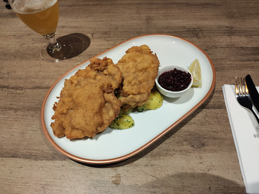Four of us came with a reservation in the evening during the week. It was busy, but there were still a few seats available as the restaurant is very large. We had two different spreads with sourdough bread as a starter, which was excellent. We sampled the in-house beers, with the ‘Das Altsteirische’ being my favourite. For starters, my companions had a pumpkin cream soup, which was good, and a lamb's lettuce salad garnished with fried bacon and eggs (excellent). For the main course we had a pulled pork burger which was ok, gnocchi with pumpkin cream and cress. A Styrian chicken salad and an onion roast with potatoes and bacon beans as a side dish. The roast onion was good. I prefer slightly thicker pieces of meat (can also be smaller and not completely pounded flat) and lots of sauce (little things). The sauce was excellent, the fried onions were good, but not enough for an onion roast. The service was extremely friendly and polite. We would love...