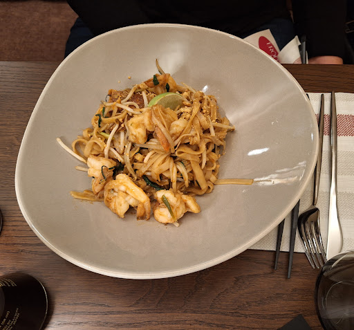 Das Essen ist sehr gut und sehr hübsch angerichtet, hatten heute Pad Thai mit Shrimps und Sake Cheese Don (=Lachs), da gab es eine Rose aus Lachs auf dem Teller 🤩. Das Personal ist super nett. Das Ambiente ist je nachdem- eigentlich hübsch eingerichtet, aber einige Tische sehr eng beieinander, und es ist wirklich laut, wenn voll. Somit: Kommt drauf an , wann und wo man sitzt. Heute (Freitag Abend) leider nix für mich, Dienstagabend (war ich schon mal da😊)wars schön ruhig und leer. Wir kommen sowieso wieder, aber ich nicht mehr am Wochenende 😆, ich brauch es ruhig. Aber das Essen muss ich noch durchprobieren, hatte ja noch...