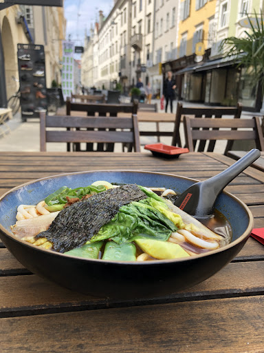 The menu was in German and Japanese, but it was illustrated with images of the main dishes. That made ordering much easier. The waitress was nice and gave us enough time to make decisions. We ordered Edamame and Tekka Maki as appetizer and ramen and Yasaitempura as a main dish. Both, Edamame and Maki were fine but too small. Additionally, I think Maki could have been better rolled and cut. Between two main dishes, I liked more Yasaitempura. The crust was well done. Moreover, vegetables remained juicy under fried coating. In my opinion, Ramen lacked a bit of spiciness and some chili would improve it. Anyhow, portions were large, but the good thing is that we could’ve pack leftovers. Two more good things about this place are the possibility to pay with card and free wi-fi.