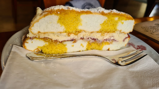 Ein schönes Cafe/Restaurant mit einigen Abstrichen. Hatte eine Kardinal-Schnitte die gut schmeckte und das Getränk war auch gut. Die Frau die uns bediente war sehr schnell und auch freundlich. Im Gastraum war es sauber. Es befand sich eine interessante kleine Bar im inneren. Ebenso war ein kleiner Gühlglssschrank vorhanden wo man sehen konnte was es für schöne Kuchen und Torten zum verspeisen vorhanden waren. Einige negative Punkte zur Ordnung. In der Mitte des Innenbereiches steht ein Billardtisch der als Abstelltisch benutzt wurde. Jede Menge Prospekte und Bücher zum verkaufen. Ebenso befanden sich kleine Zuckertütchen für Gäste auf diesem, sowie Pappdeckel für die Gläser. Weinflschen für den Verkauf waren auch darauf geparkt. Die Ofenbank ist zur Ablage für Zeitungen und Illustrierte geworden. Kinder der Besitzer die sich auch auf der Ofenbank hingelegt hatten um da auf dem Hany zu spielen. Also gleichzeitig wohl zum Spielzimmer geworden. Auf der Terasse ging auch alles zügig voran. Dadurch das der Raum sehr alt war und bestimmt schon viele schöne Feiern erlebt hat und auch noch erleben sollte würden sich viele freuen wenn es mehr Ordnung und Ruhe für diesen Raum geben würde. Also bitte würdigt diesen Raum. Die Schnitzereien an der Decke geben diesem Raum auch etwas besonderes. Die Toiletten sind leider auch in der Zeit stehen geblieben. Falls wir wieder in der Nähe sind kommen wir aber wieder zu...