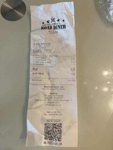 Einfach nur unverschämt, das Essen kommt immer maximal lauwarm an und ist alles andere als günstig. Hatten da ein paarmal bestellt da nichts in der Gegend ist, allerdings wird immer wieder aufs neue enttäuscht. Ich hatte vor kurzem erst nen Cheeseburger, eigentlich was echt simples. Der allerdings war in der Mitte komplett roh, das Brot war ziemlich fest und nicht mal angeröstet und der Rest einfach der ärgste Sumpf in nem Brötchen. Wie kann man bei nem Burger Patty der eh schon dünn ist weil man einspart so verkacken? Und dann das ganze für solche Preise anbieten?? Sollte man sich wirklich Road Diner nennen wenn man weder den amerikanischen Flair hat noch einen simplen Burger machen kann? Der einzige Grund wieso so ein Lokal „überlebt“ ist wirklich weil es nichts anderes in der Gegend gibt und sie es ausnutzen können. Ich schreibe nie Rezessionen ABER diesmal war der Bogen echt überspannt. Ich hatte ein Viertel des Burgers bis ich die Mitte gesehen hab und mir ging es danach richtig schlecht. Die Behörden sollten...