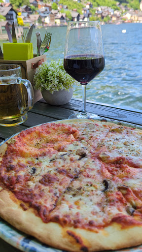 We ordered a gosser marzen beer, rotwein gespritzt (red wine spritz), cafe latte, farmers pizza, pizza funghi, and pizza salami. Great ambiance dining by the waterfront with a view of Halstatt. While I don't think the food is anything to write home about, it is a good size portion at a reasonable price given the view. Their breakfast menu looked delicious, but unfortunately is only...