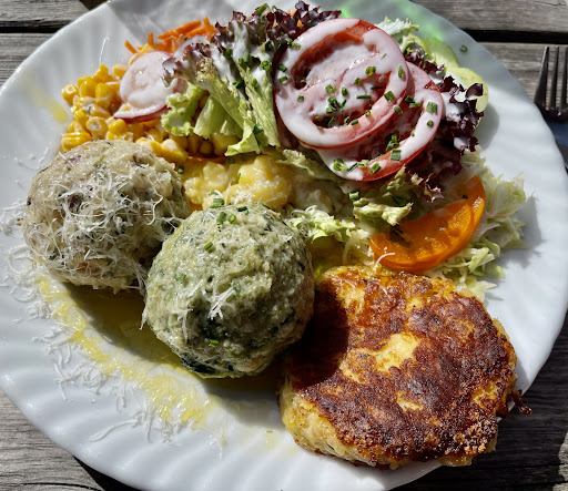Es war das leckerste Knödeltrio, was ich während meiner 7 Tage in der Region gegessen habe. Um so beeindruckender, wenn man überlegt, welche Logistik dahinter steht. Wir suchten einen ruhigen Platz und wurden auf der Rückseite (zum Eingang) fündig. Andere Besucher beneideten uns um unseren schönen Platz. Mit freiem Blick auf die Berge ließen wir es uns schmecken.