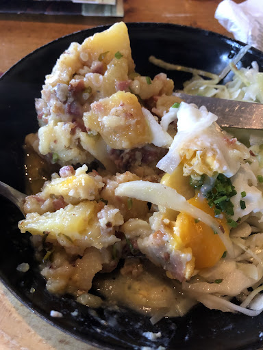 Das Essen kam dann extrem schnell, zu schnell: Gröstl mit halbrohem Speck, labberigem Eiweiß, „Bratkartoffeln“ sehr matschig mit „irgendwas“ drin. Definitiv keine Bratkartoffeln im klassischen Sinn.